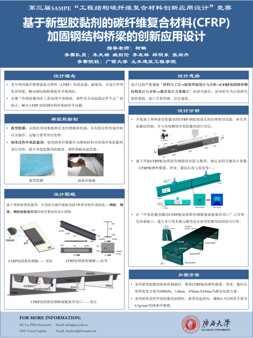 SAMPE“工程结构碳纤维复合材料创新应用设计”员工竞赛鼓励参赛者充分发挥碳纤维复合材料的轻质高强、耐腐蚀、可设计等性能,提出该材料在工程结构中的创新性应用,并给出可靠的设计分析与说明。竞赛为国内外高校土木工程、交通工程、海洋工程、复合材料、力学等专业参赛者提供了一个公平公正、施展才华、拓宽视野的国际化舞台。